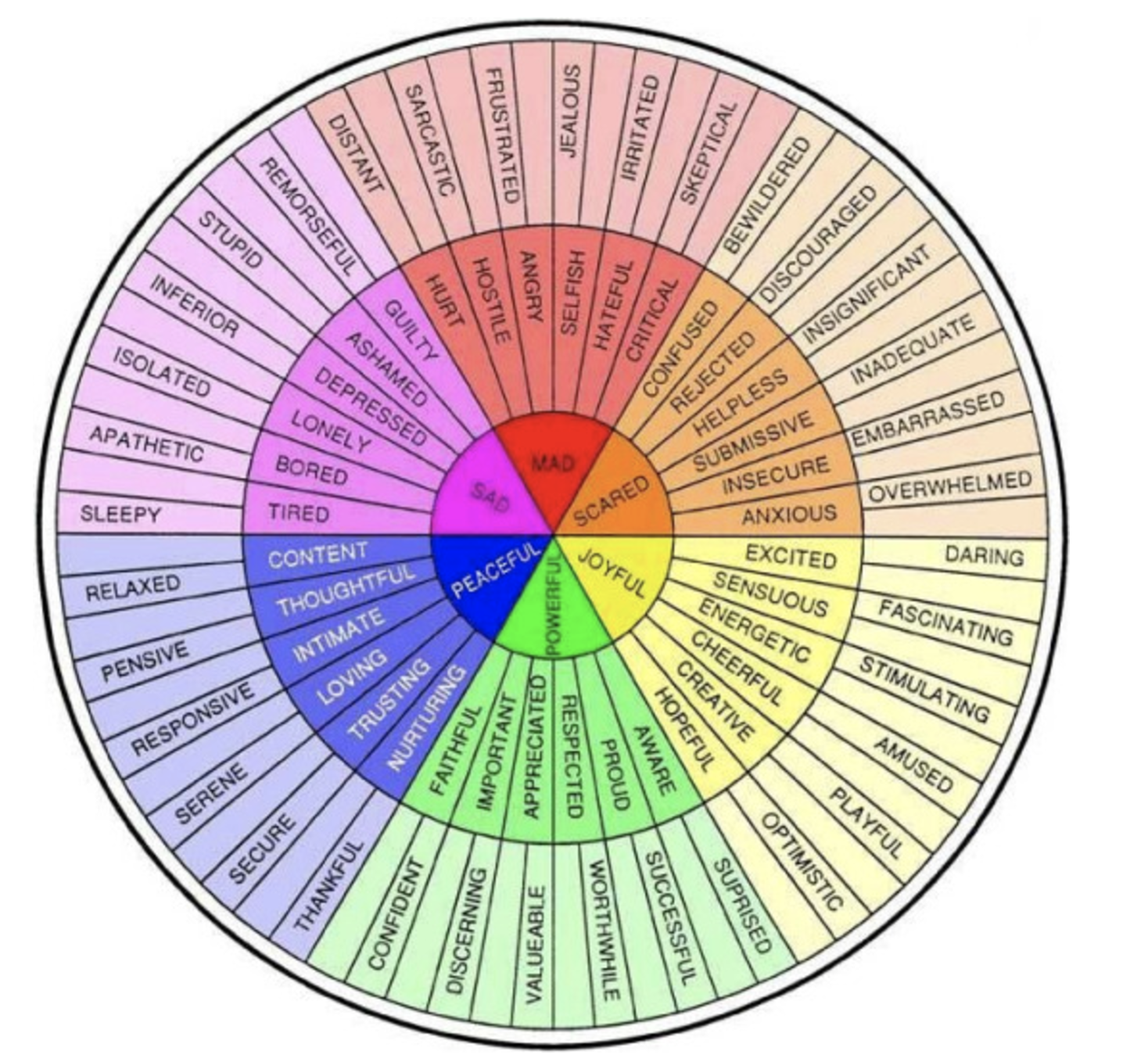 After discussing the yin-yang concept, I like to introduce the emotion wheel—a visual tool that illustrates a wide range of emotions and their opposites. Most adults can identify the basic emotions at the center of the wheel, but they often struggle to name the more nuanced feelings that branch out from the center. This lack of vocabulary can make it difficult to process what they’re experiencing, leaving them feeling lost and overwhelmed. It’s like trying to solve a puzzle without all the pieces.